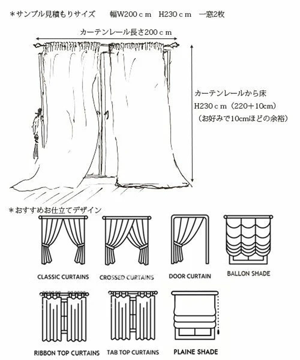 W200×H230cm1窓2枚(裏地あり/トリム付)の参考上代になります。