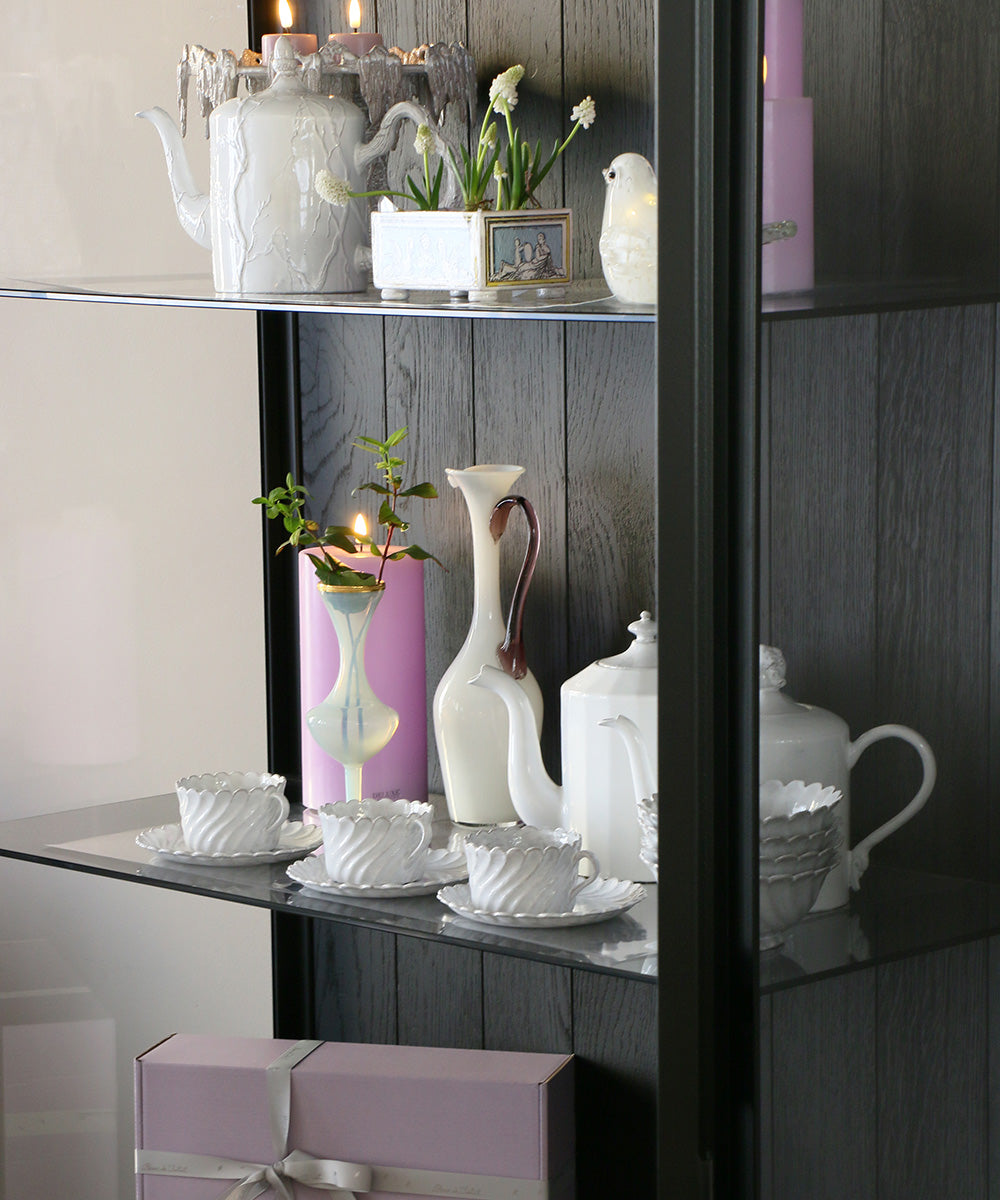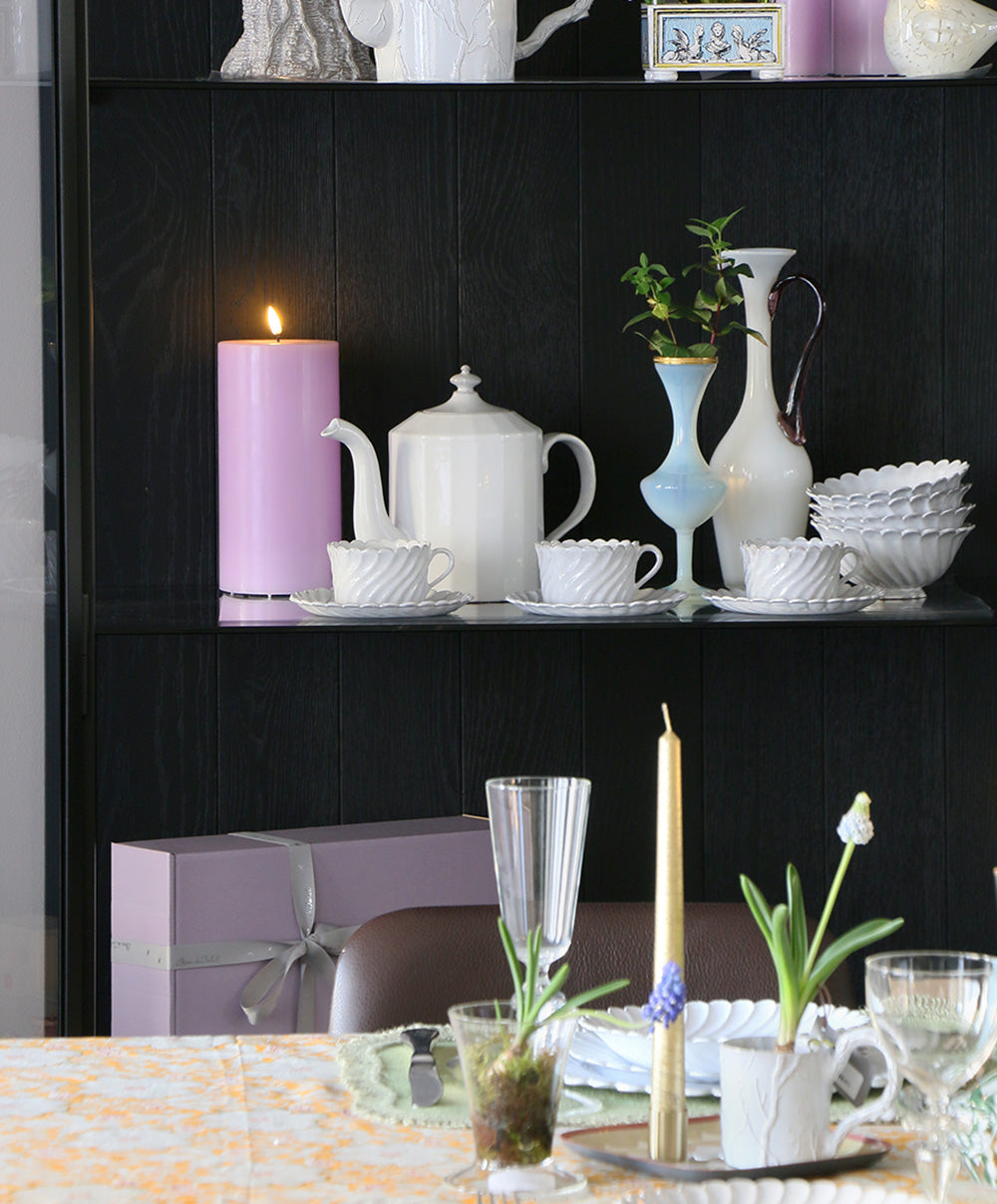 八角形の皿やプレート、ボトル、ティーポット、そして繊細に角を取ったカップたち。