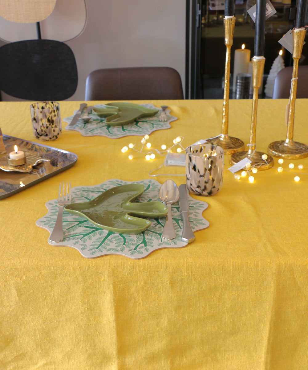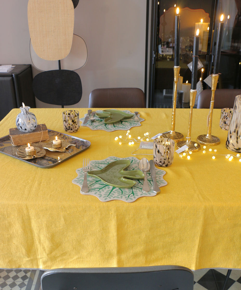 あえてイエローなどコントラストが際立つテーブルリネンで