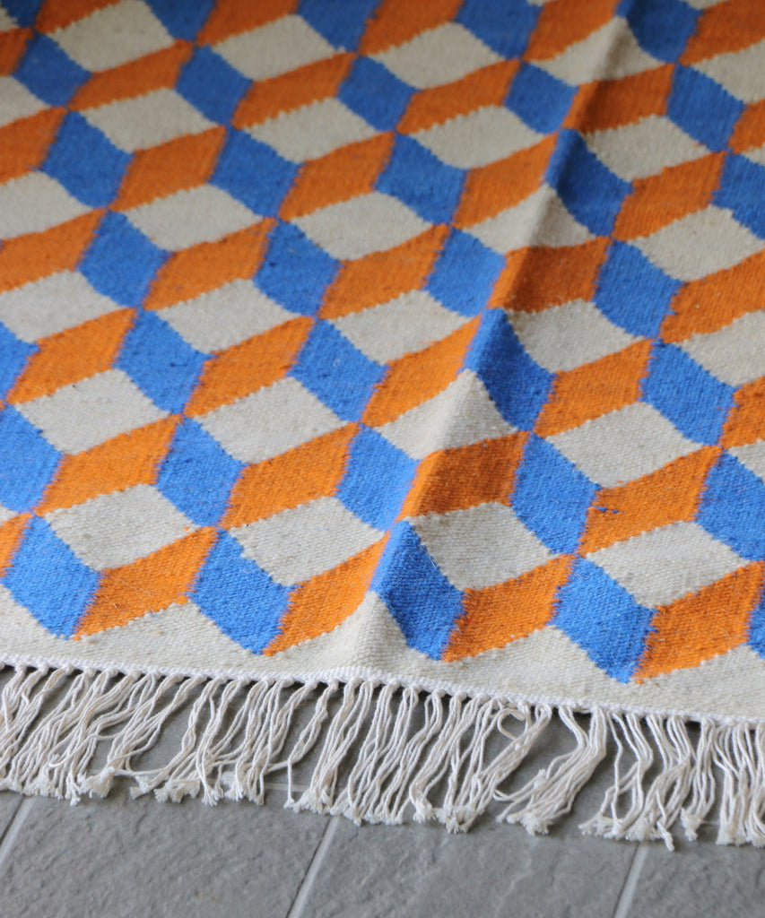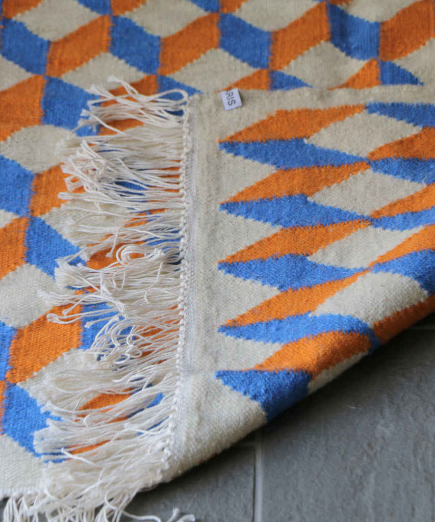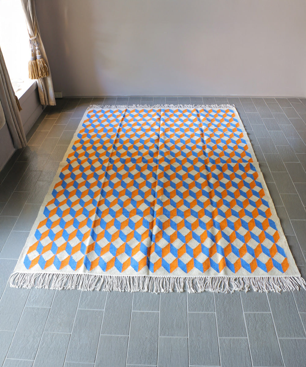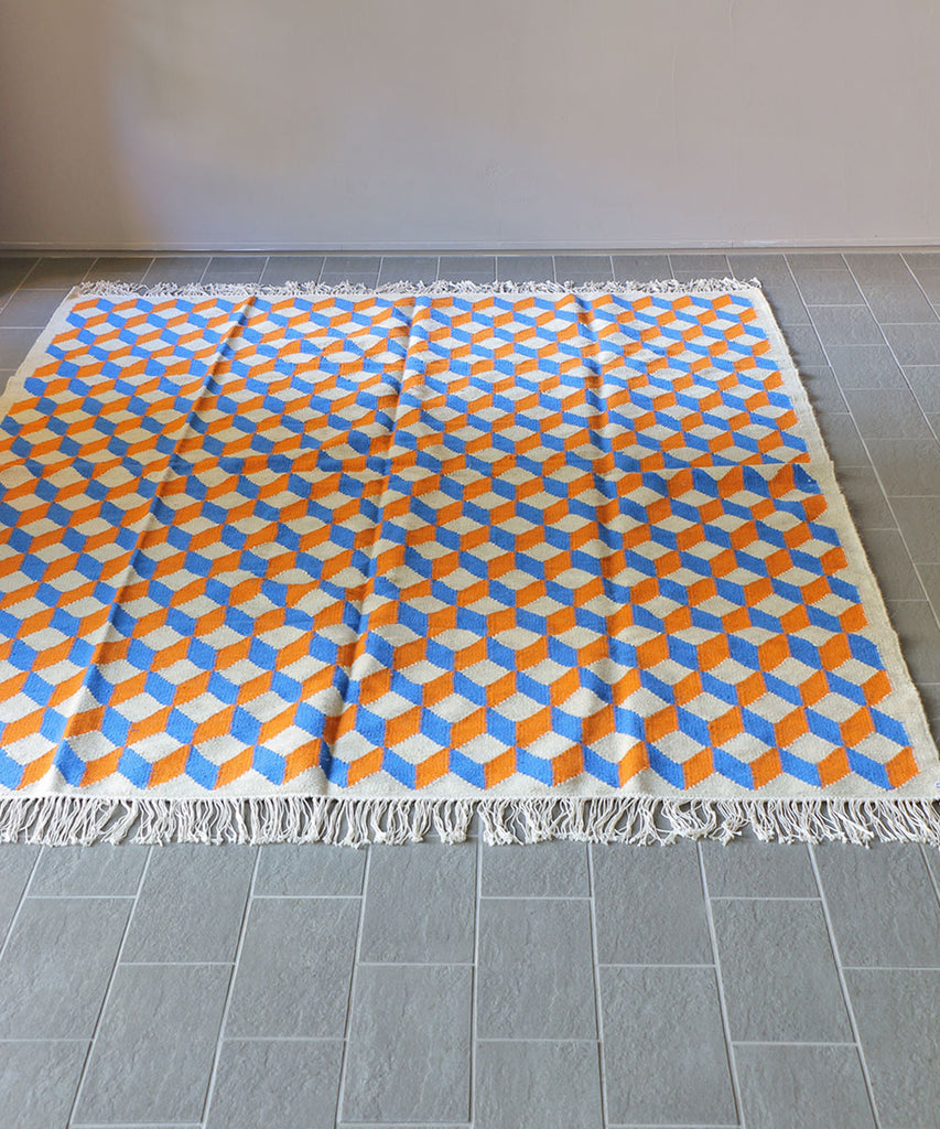 PO!PARIS キューブ・ウールキリムラグ・ブルー/オレンジ・240×170