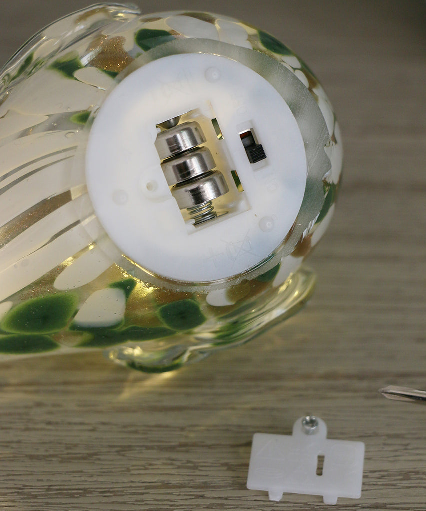 ガラスの中に小さなLEDガーランドがぼんやりと灯ります。