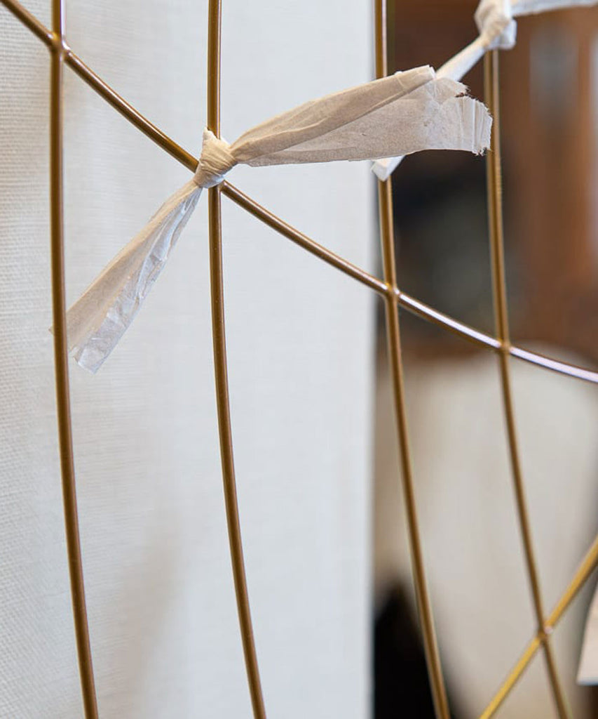 羽部分の骨組みに付属の紙をおみくじのように結びます。